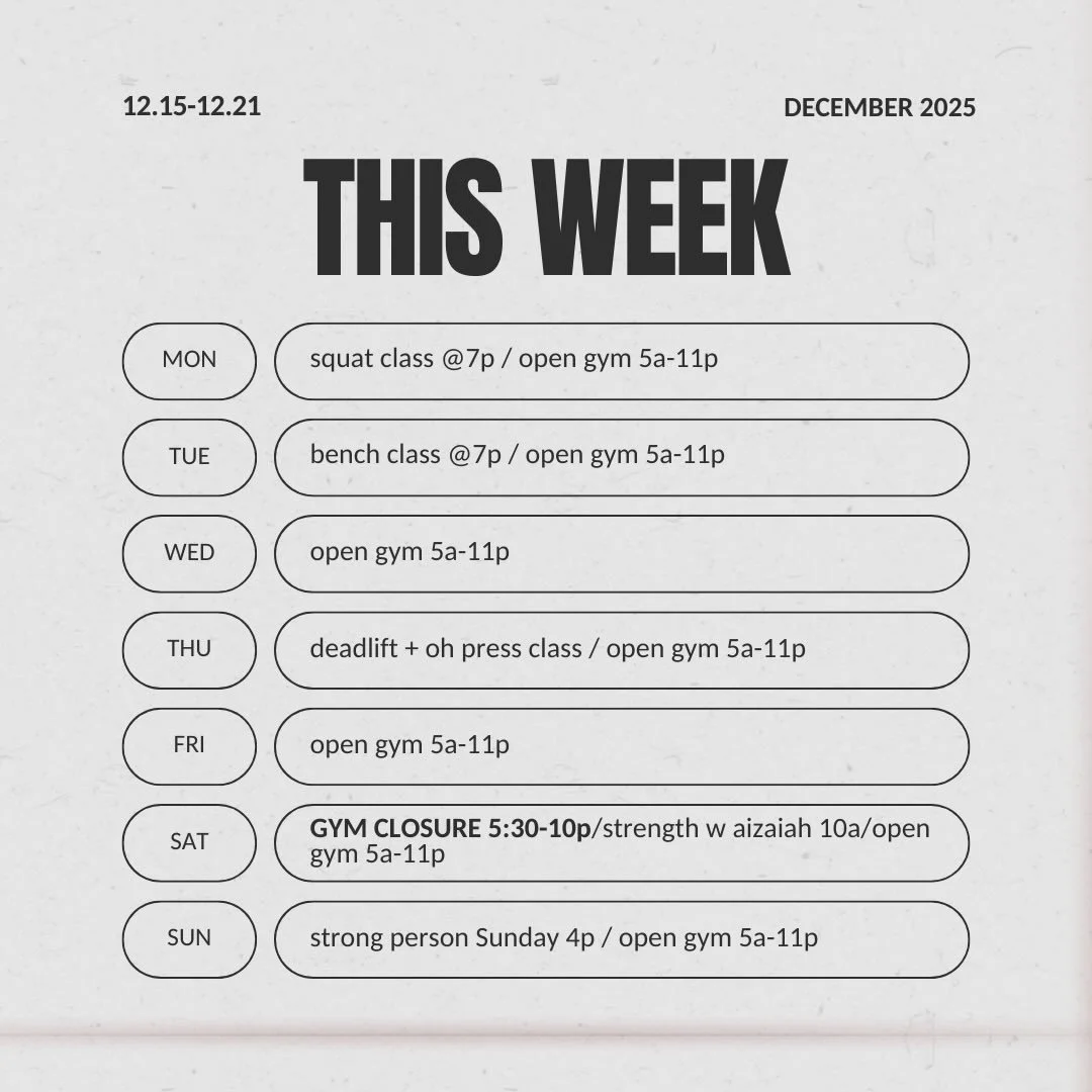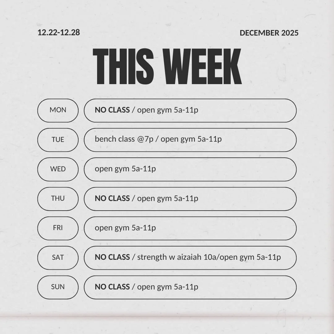 We offer classes, open gym and private coaching. Classes are created for all levels, bodies, abilities and sizes. No one is turned away for lack of funds. Open gym is 5am-11pm, seven days a week.